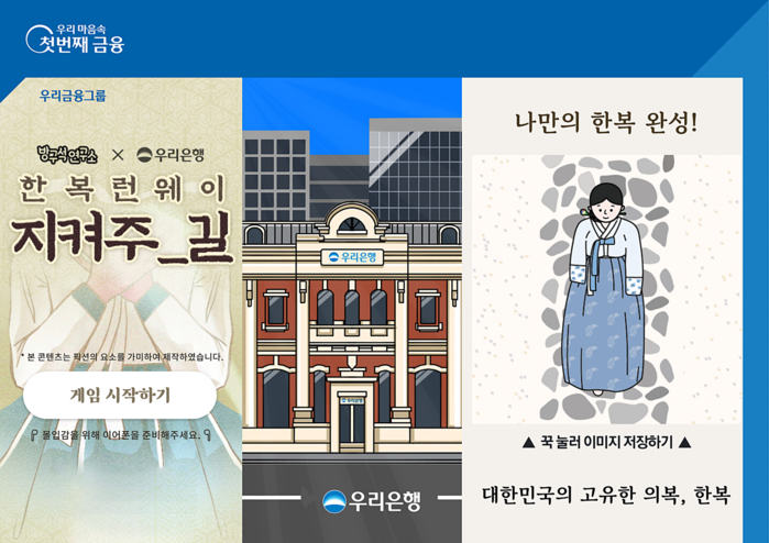 [시민일보 = 홍덕표 기자] 우리금융지주 자회사 우리은행은 삼일절을 맞아 콘텐츠 플랫폼 '방구석연구소'와 함께 고객 참여형 SNS캠페인 '지켜주_길, 한복 런웨이'를 오는 31일까지 실시한다고 1일 밝혔다.