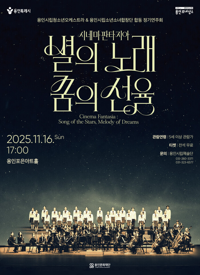 [용인=오왕석 기자] (재)용인문화재단(이사장 이상일)은 오는 11월 16일(일) 용인포은아트홀에서 용인시립청소년오케스트라와 용인시립소년소녀합창단 합동 정기연주회 <시네마 판타지아 : 별의 노래, 꿈의 선율>을 개최한다.