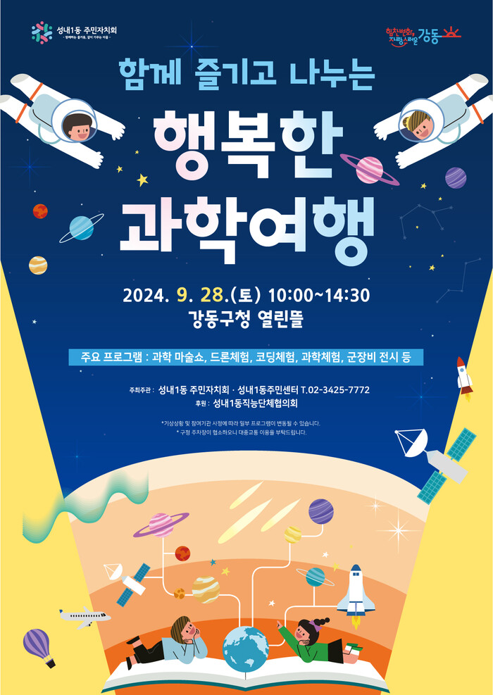 [시민일보 = 이대우 기자] 서울 강동구(구청장 이수희) 성내1동이 오는 28일 구청 앞 열린뜰에서 ‘제4회 함께 즐기고 나누는 행복한 과학여행’ 축제를 개최한다.