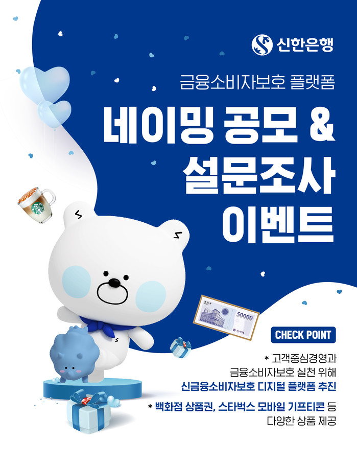 [시민일보 = 이대우 기자] 신한은행(은행장 진옥동)은 ‘새로운 금융소비자보호 디지털 플랫폼의 네이밍 응모 및 설문 이벤트’를 오는 12일까지 실시한다.