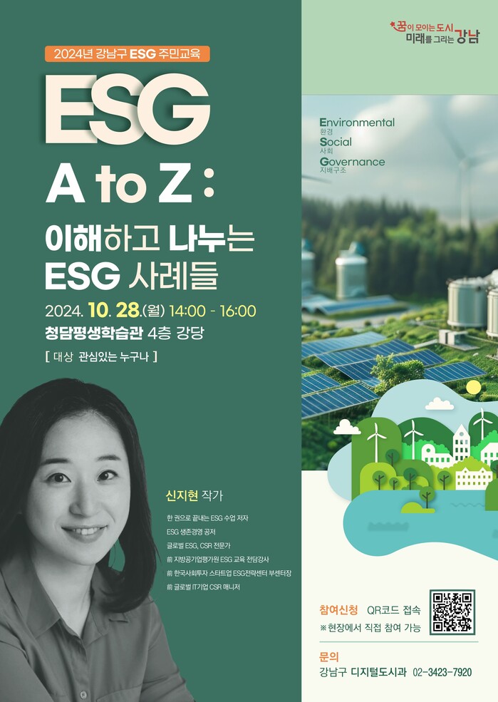 [시민일보 = 이대우 기자] 강남구(구청장 조성명)가 오는 28일 오후 2~4시 청담평생학습관 4층 강당에서 구민 150여명을 대상으로 ESG 특강을 개최한다.
