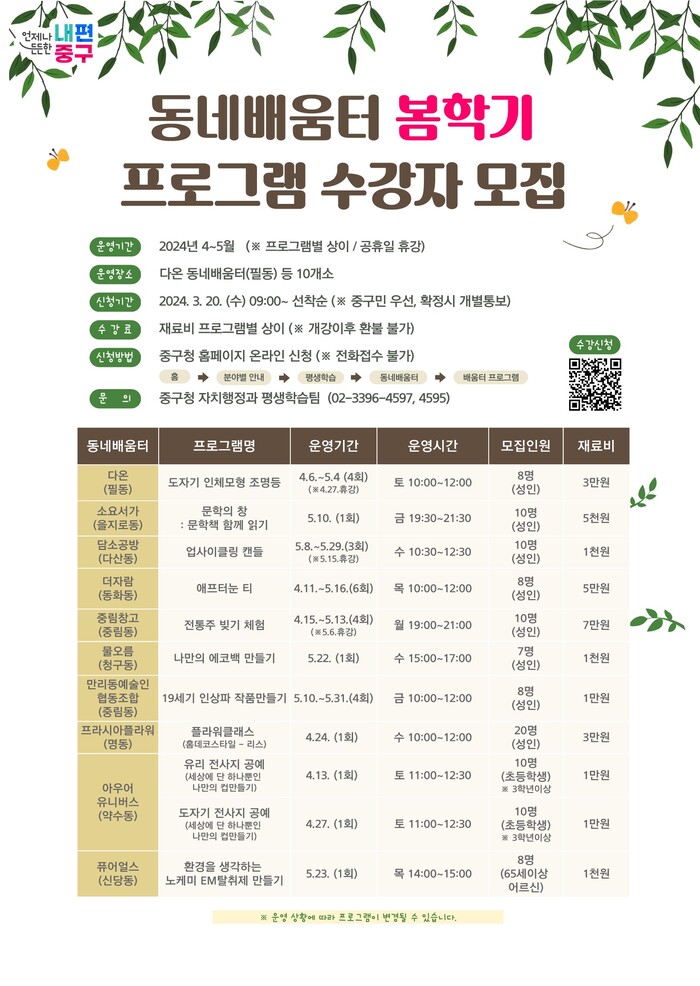 [시민일보 = 여영준 기자] 서울 중구가 4~5월 ‘동네배움터 봄학기 프로그램’을 다온동네배움터 등 10곳에서 진행한다.