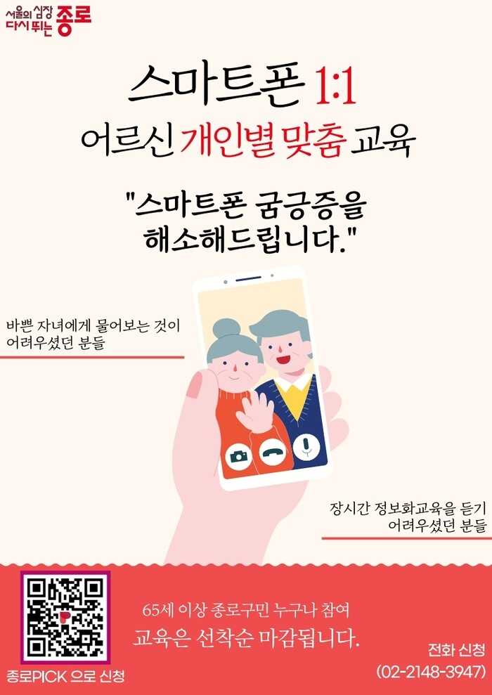[시민일보 = 이대우 기자] 서울 종로구(구청장 정문헌)가 내달부터 일상 속 스마트폰 활용을 도울 '어르신 1:1 스마트폰 1:1 교육'을 시범 운영한다.