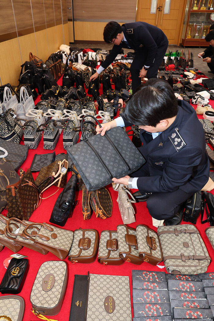 | ▲ 23일 오전 인천시 중구 인천본부세관 대강당에서 세관 직원들이 밀수조직으로부터 압수한 명품 위조품을 살펴보고 있다. (사진=연합뉴스 제공) |