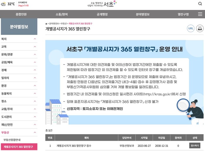 | ▲ ‘개별공시지가 356 열린창구’ 구청 홈페이지 화면 (사진=서초구청 제공) |