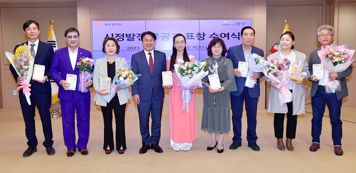 | ▲ 강기정 광주광역시장이 6일 오전 시청 비즈니스룸에서 시정발전 유공자에게 표창을 수여한 뒤 기념촬영을 하고 있다./광주광역시 제공 |