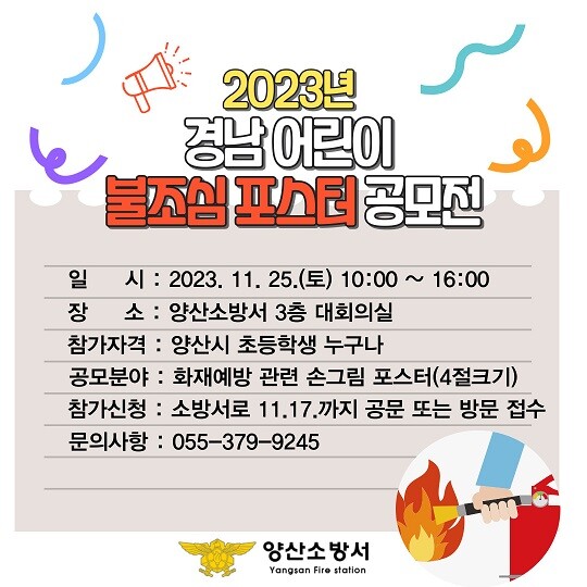 참가 대상은 양산시 초등학생이면 누구나 가능하며, 신청 접수 기간은 17일까지로 소방서에 신청서를 제출하면 된다. 공모전은 25일 오전 10시부터 오후 4시까지 양산소방서에서 진행된다.