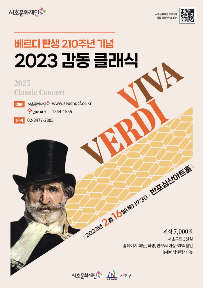 [시민일보 = 이대우 기자] 서초문화재단은 베르디 탄생 210주년을 맞이해 오는 16일 반포심산아트홀에서 ‘2023 감동클래식 (VIVA VERDI)’의 막을 올린다.