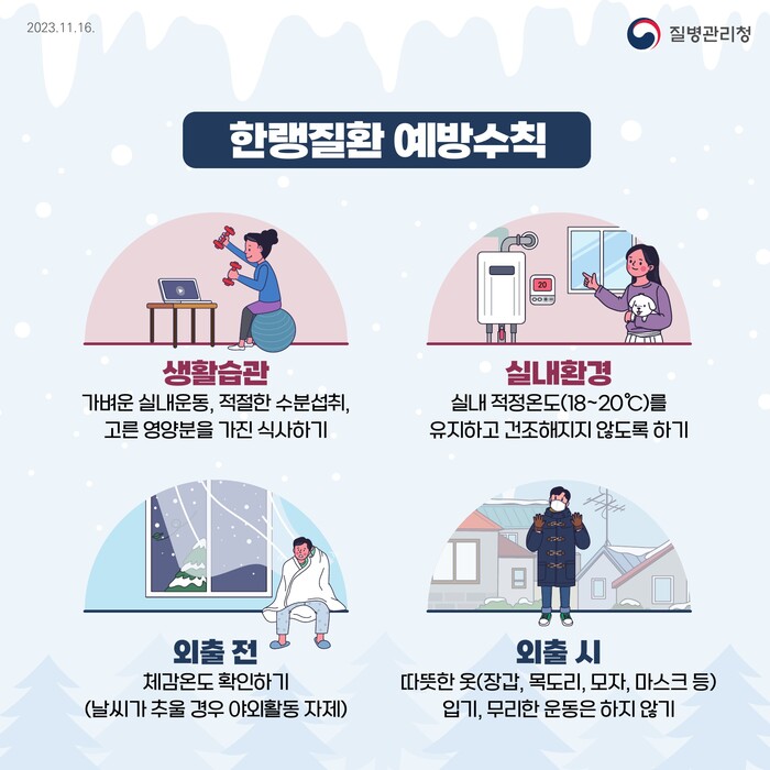보건소 관계자는 “심혈관질환, 당뇨병, 뇌졸중 등 만성질환을 가진 65세 이상 노령층은 급격한 온도 변화에 특히 주의해야 한다”며 “실내에서는 적절히 수분을 섭취하고 적정 습도와 실내 온도를 유지하는 한편 외출 시에는 장갑, 목도리, 모자, 마스크 등을 착용하고 무리한 운동은 삼가야 한다”고 강조했다.