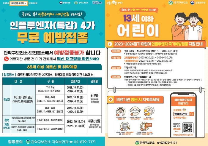 [시민일보 = 여영준 기자] 서울 관악구(구청장 박준희)가 20일부터 오는 2024년 4월까지(취약계층은 11월까지) 어린이, 임신부, 어르신 등을 대상으로 독감 예방접종을 무료로 실시한다.