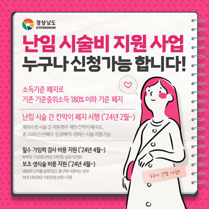 [창원=김점영 기자] 경남도가 임신과 출산이 행복한 선택이 되는 사회적 환경을 조성하기 위해 난임부부 시술비 지원 확대, 임신 사전 검사 등 도내 임신을 준비하는 부부에 대한 지원을 대폭 확대한다고 밝혔다.
