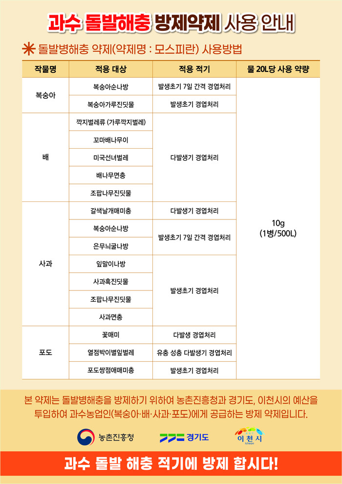 [시민일보 = 민장홍 기자] 경기 이천시가 과수에 발생하는 돌발해충의 적기 방제를 위한 약제를 지원한다고 28일 밝혔다.