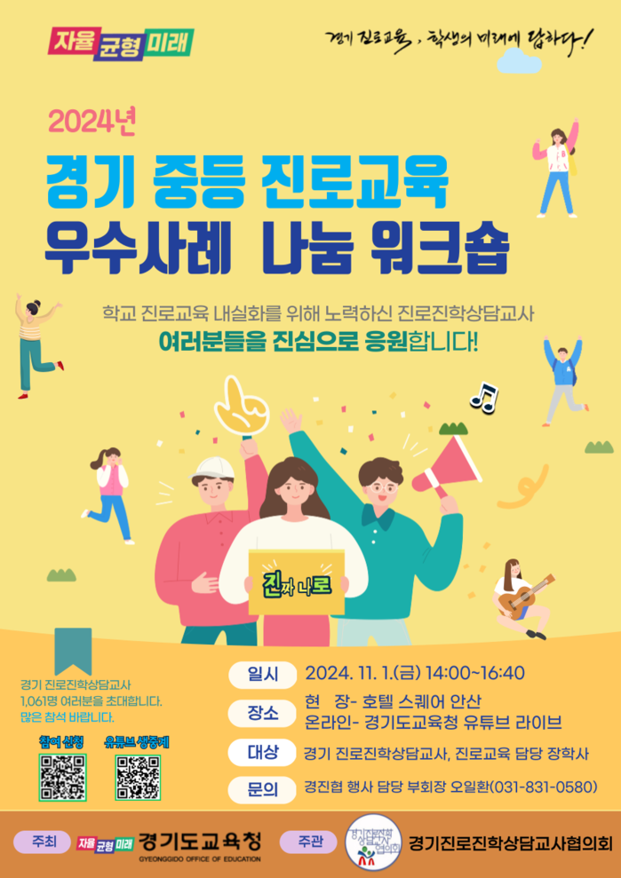 주요 내용은 ▲경기 중등 진로교육 우수사례(진로상담, 진로수업, 진로체험) 발표 ▲우수사례 관련 질의응답 ▲우수 진로교육 사례의 현장 적용을 위한 포럼 ▲경기진로교육의 새로운 방향 모색 협의 순으로 구성했다.