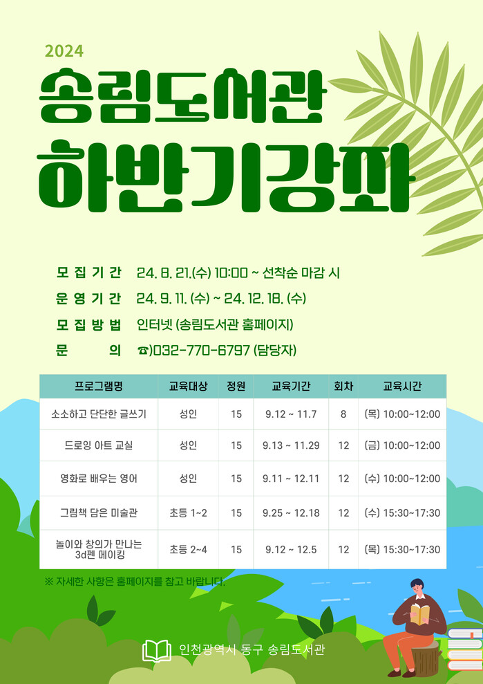 [인천=문찬식 기자] 인천 동구 송림도서관은 2024년 하반기 강좌 수강생을 선착순 모집한다고 밝혔다.