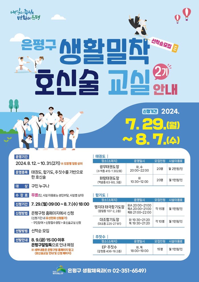 이번 하반기 호신술교실 신청은 지역내 주민 누구나 가능하며, 오는 8월7일 오후 6시까지 은평구청 홈페이지에서 선착순으로 접수하면 된다.