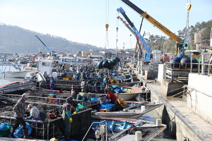 | ▲ 다목적 인양기를 이용해 물김을 운반하고 있는 어민들 / 자료사진 = 해남군 제공 |