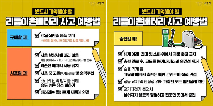이에 따라 광주소방안전본부는 ‘국내안전인증(KC 인증) 등 안전 인증 제품 사용’, ‘사용설명서 준수 및 정품 충전기 사용’, ‘침대·소파 등 가연성 물질이나 현관·비상구 등 대피 동선에서의 충전 금지’, ‘배터리 위에 무거운 물건 적재 금지’, ‘직사광선·고온·습기가 많은 장소 보관 금지’ 등의 안전수칙 준수를 당부했다.