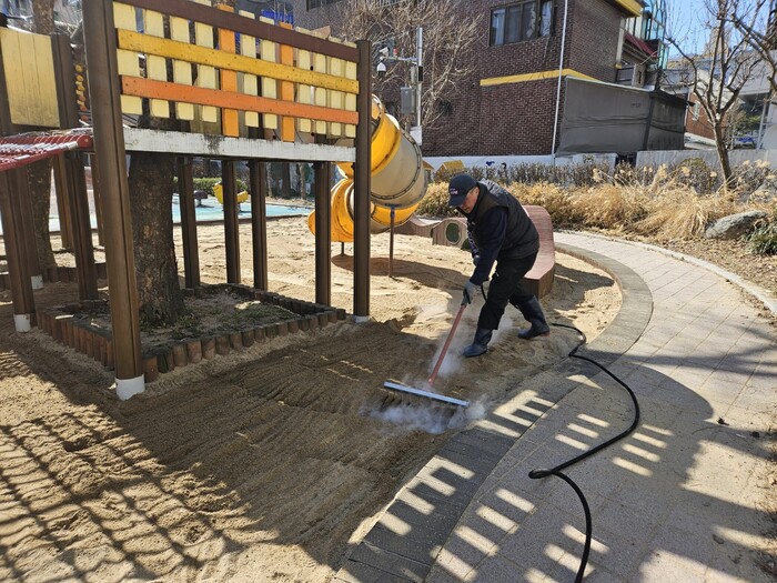 [시민일보 = 여영준 기자] 서울 중랑구(구청장 류경기)가 따뜻한 날씨에 어린이들의 야외활동이 많아질 것에 대비해 어린이들의 주요 활동 놀이공간인 모래 놀이터 소독에 나섰다.