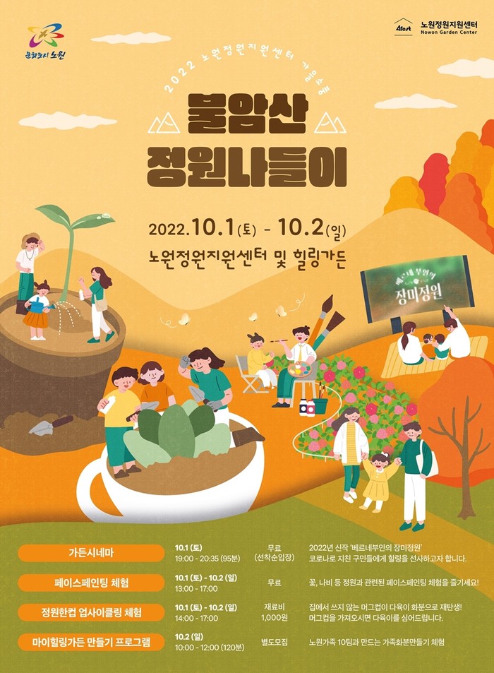 불암산 힐링타운 내 노원정원지원센터와 힐링가든에서 진행되는 이번 행사는 가을을 맞아 구민들이 불암산의 자연을 만끽하며 휴식과 힐링의 시간을 보낼 수 있도록 돕고자 마련됐다.