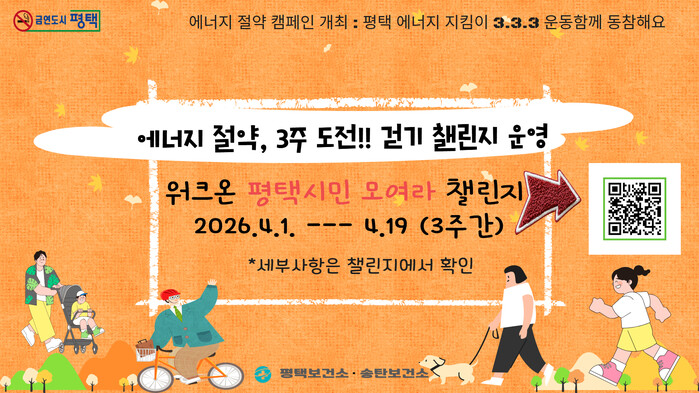 평택보건소 관계자는 “최근 에너지 가격 상승으로 시민들의 부담이 커진 상황이지만, 일상 속 한 걸음 한 걸음이 지구 환경을 지키고 나의 건강 수명을 늘리는 가장 소중한 실천 방법”이라며, “이번 챌린지를 통해 걷는 즐거움이 곧 에너지 절약 실천으로 이어지는 건강한 생활 문화로 정착되길 바란다”고 전했다.