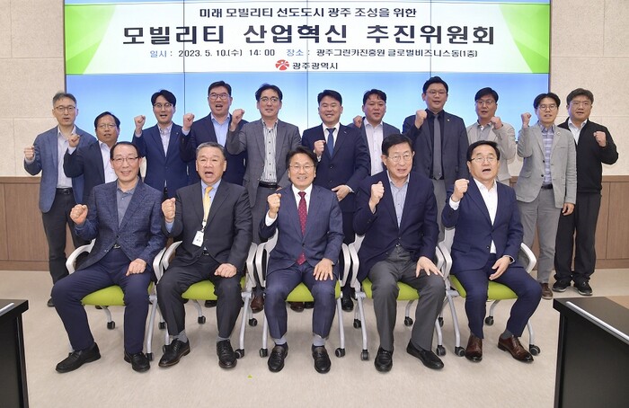 | ▲ 강기정 광주광역시장이 10일 오후 광산구 광주그린카진흥원 글로벌비즈니스센터에서열린 '모빌리티 산업혁신 추진위원회 2차 회의'에 참석해 조환익 추진위원장 등 위원들과 기념촬영을 하고 있다./광주광역시 제공 |