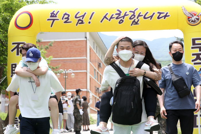 20일 오후 강원 화천군 육군 15사단 신병교육대대에서 열린 입영식에서 입영 장병이 가족을 업고 행사장으로 향하고 있다. 부대는 코로나19 장기화로 2020년 1월20일부터 입영 장병만 참여하는 입영식을 진행해오다가 사회적 거리두기 해제로 2년 5개월 만에 행사에 가족 참석을 허용했다.