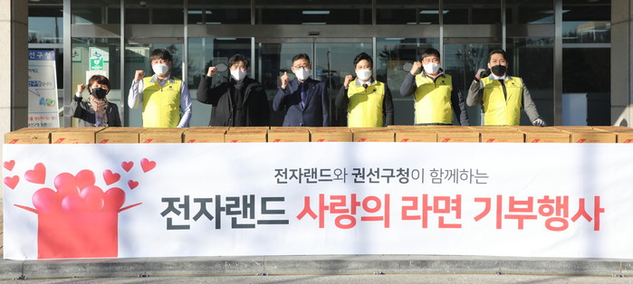 경기 수원시 권선구가 최근 전자랜드 서수원점로부터 지역내 취약계층을 위한 라면 153상자(300만원 상당)를 기부 받았다. 사진은 이날 전달식에서 이귀만 구청장(가운데)과 관계자들이 기념촬영을 하는 모습. (사진제공=권선구청)