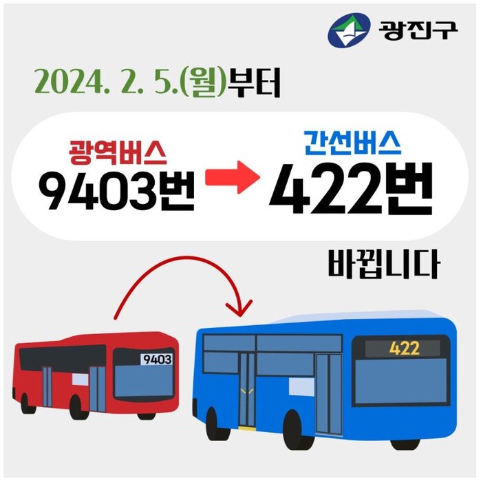 [시민일보 = 여영준 기자] 서울 광진구(구청장 김경호)는 대중교통비 부담 완화를 위해 광역버스 9403번을 422번 간선버스 노선으로 개편했다고 4일 밝혔다.
