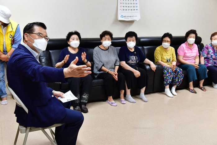서울 중랑구는 지난 13일부터 순차적으로 지역 경로당 129곳을 돌며 현장 점검에 나선다. 이날 류경기 구청장은 지역 경로당 4곳을 돌며 노인들의 안부를 살폈다. 사진은 이날 금호어울림아파트 경로당을 찾은 류 구청장(왼쪽)이 노인들과 이야기를 나누고 있는 모습. (사진제공=중랑구청)