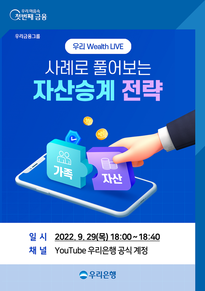 [시민일보 = 홍덕표 기자] 우리은행이 오는 29일 오후 6시에 우리은행 유튜브 공식계정에서 언택트 자산관리 세미나 ‘우리 Wealth LIVE’를 개최한다.