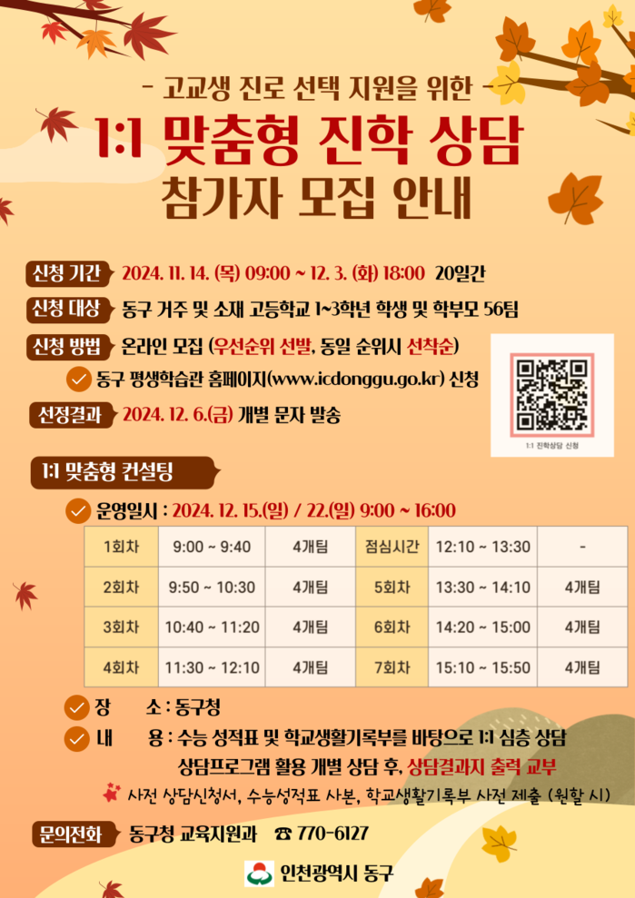 [인천=문찬식 기자] 인천 동구가 지역내 입시생들의 2025년 정시 대입을 지원하기 위해 14일~12월3일 1대1 맞춤형 진학 상담 참여자를 모집한다고 밝혔다.