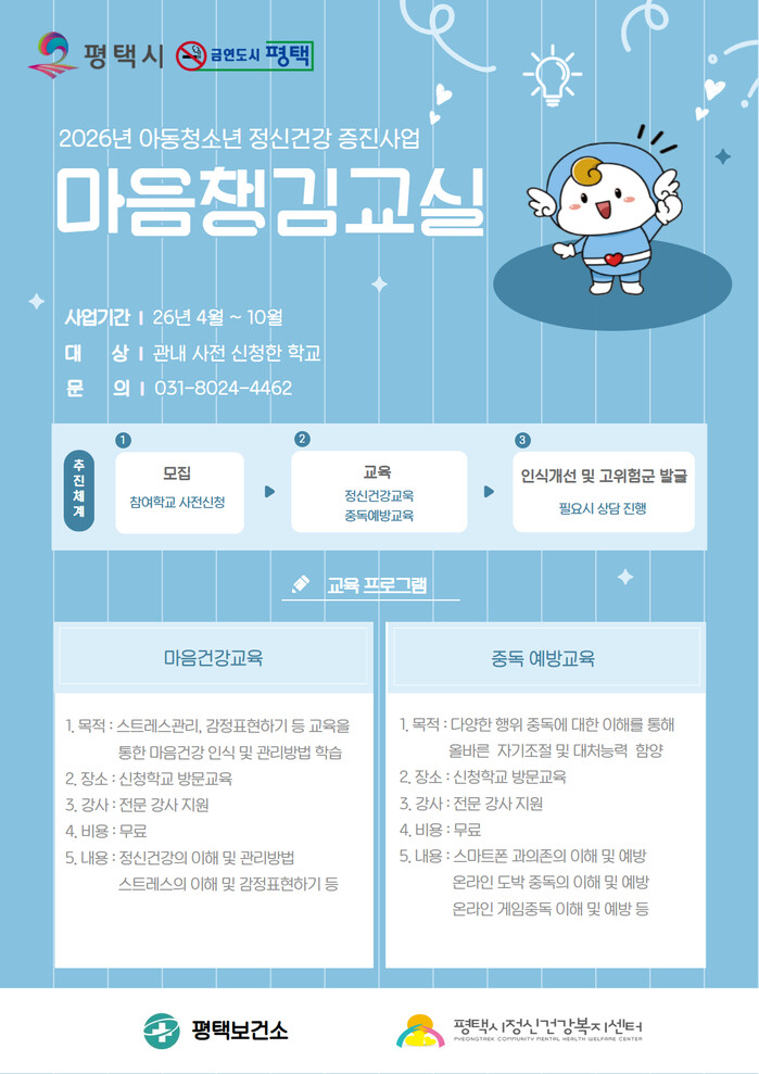 평택보건소 조미정 소장은 “아동·청소년 정신건강 문제에 대한 관심이 높아지고 있는 만큼, 관내 학생들의 마음 건강을 지원하기 위해 다양한 정신건강 서비스를 지속적으로 제공할 수 있도록 지원해 나가겠다”고 말했다.