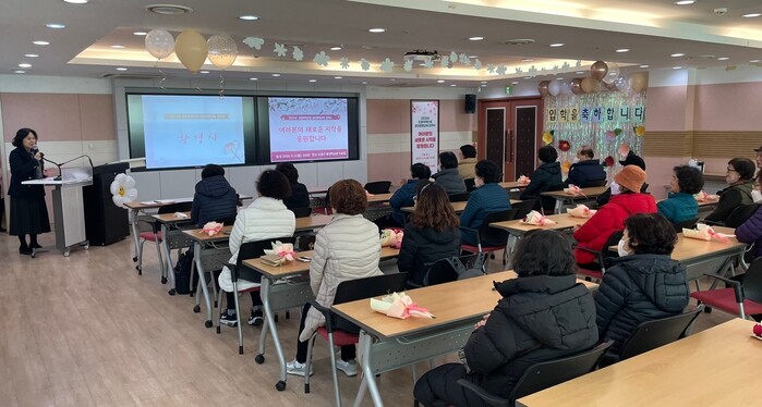 서울 도봉구는 최근 입학생 22명이 참석한 가운데 2024년 초등학력인정 성인문해교육 입학식을 열었다. 앞으로 입학생들은 3년에 걸쳐 성인 학습자 수준에 적합한 다양한 창의적 체험활동과 함께 단계별 국어·수학·통합교과 과정을 이수하게 된다. 사진은 입학식에서 입학생들이 사회자로부터 교과과정에 대해 안내받고 있는 모습. (사진=도봉구청 제공)