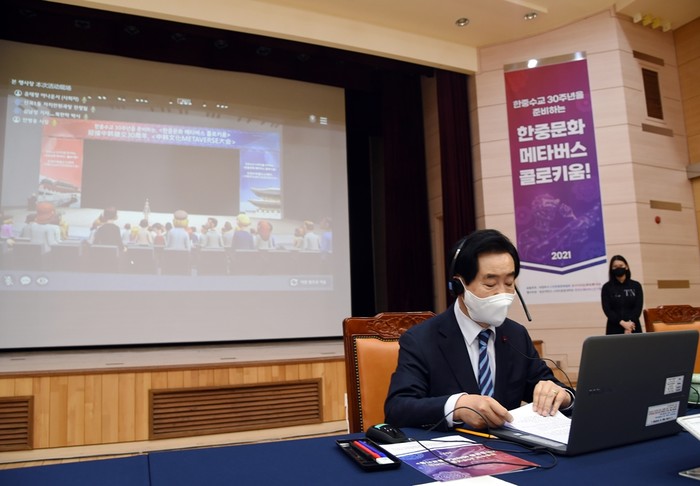 경기 의정부시가 2021~2022 한중 문화교류의 해를 기념하고, 2022년 한·중수교 30주년에 앞서 14일 한·중문화 메타버스 콜로키움을 메타버스 플랫폼 ‘Moim’을 활용해 비대면으로 개최했다. 사진은 이날 안병용 시장이 메타버스 콜로키움에 참석하고 있는 모습. (사진제공=의정부시청)