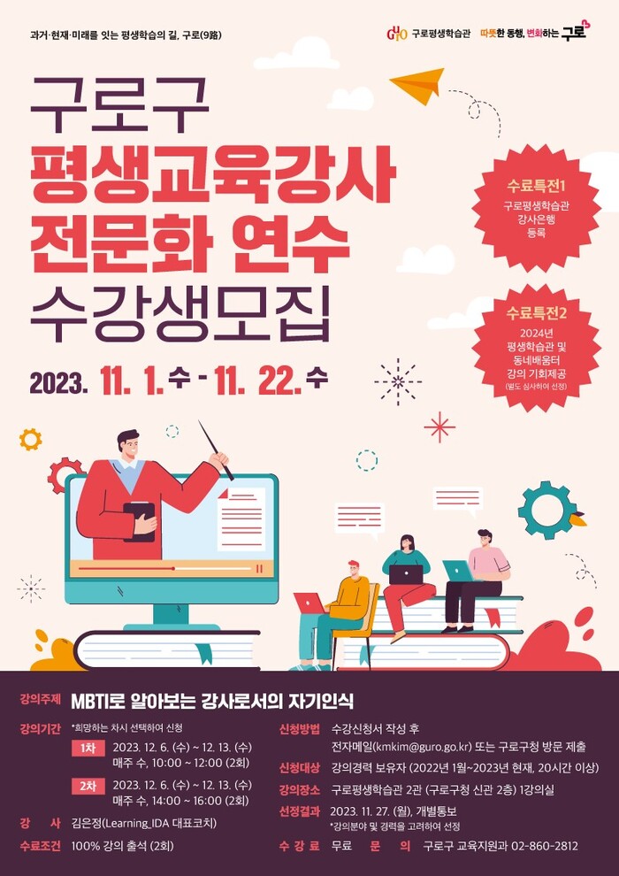 [시민일보 = 이대우 기자] 서울 구로구가 평생교육강사의 역량강화를 위한 무료 강좌를 운영한다.