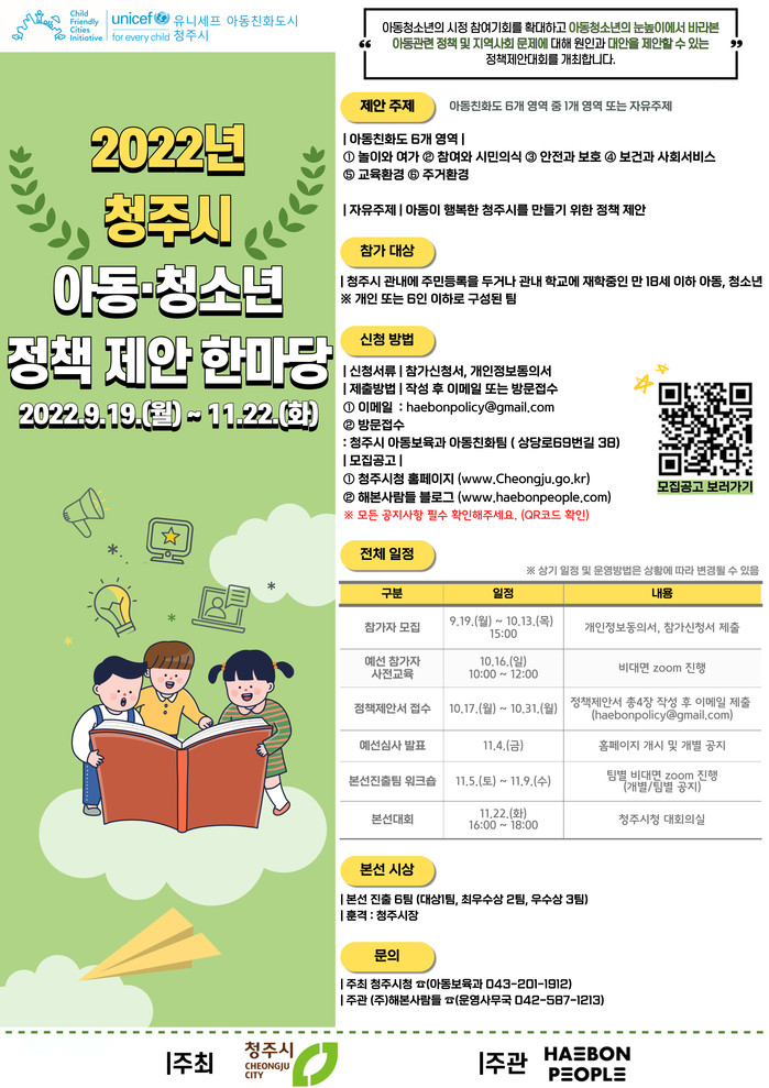 정책 제안 한마당은 아동에게 영향을 미치는 정책과 아동이 행복한 청주시를 만들기 위한 정책 제안의 장으로 청주시에 거주하거나 재학 중인 만 18세 이하 아동·청소년이면 신청 가능하다.
