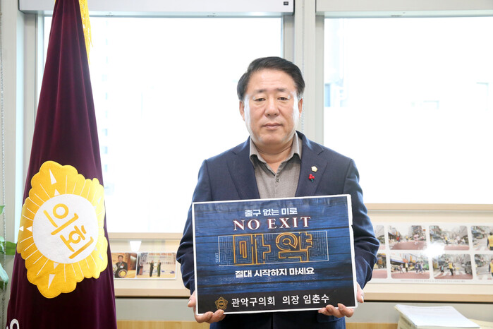 [시민일보 = 여영준 기자] 임춘수 서울 관악구의회 의장이 최근 마약 중독의 심각성을 알리고 예방을 위한 '노 엑시트(NO EXIT)'챌린지에 동참했다.