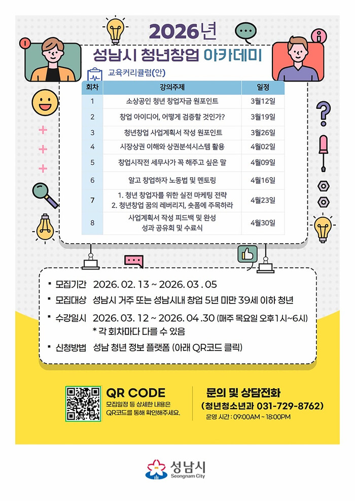 [성남=오왕석 기자] 성남시(시장 신상진)는 오는 3월 5일까지 ‘청년창업 아카데미’ 무료 교육생 30명을 모집한다.