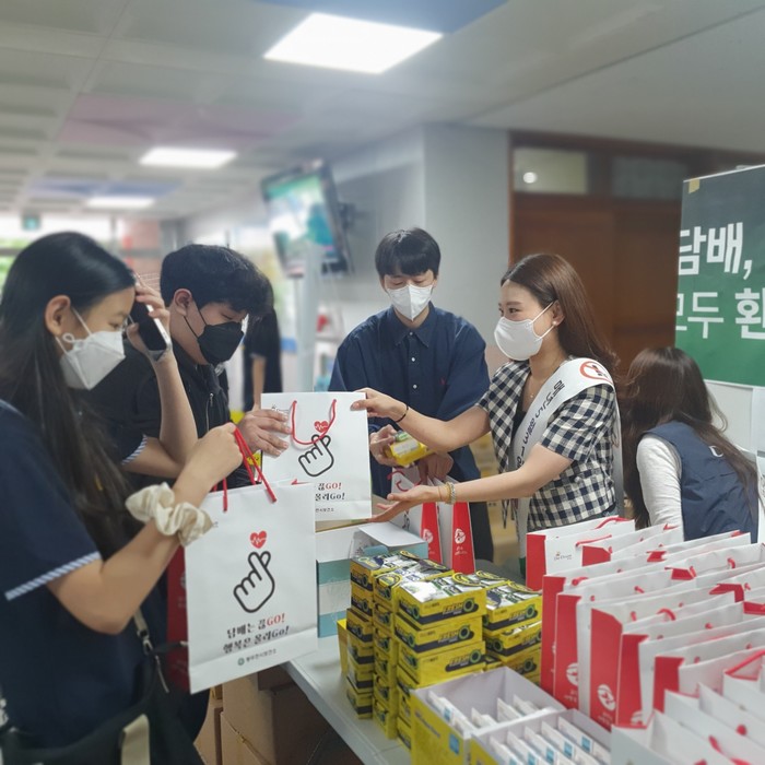 경기 동두천시보건소가 제35회 세계 금연의 날을 기념해 최근 송내중앙중학교에서 등교하는 학생 및 교직원을 대상으로 흡연예방 캠페인을 저내했다. 이날 보건교사와 학생들은 피켓을 들고 어깨띠를 두른 채 다함께 흡연 예방 홍보활동을 펼쳤다. 사진은 학생들에게 교육자료와 홍보물품을 전달하고 있는 모습. (사진제공=동두천시청)
