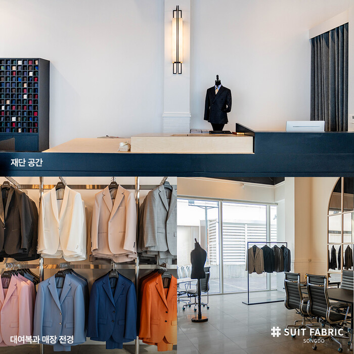 새로 오픈한 슈트패브릭 송도는 인천 테크노파크역 2번 출구에 위치한 송도 최대 규모의 프리미엄 웨딩홀 ‘메리빌리아(MarryVilia)’ 1층에 단독 입점했다. 슈트패브릭 송도는 청담 본사 직영으로 운영되며 제품의 품질과 서비스를 동일하게 제공한다.