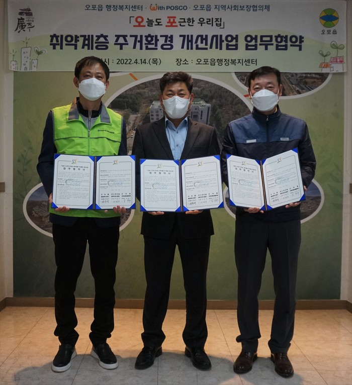경기 광주시 오포읍 지역사회보장협의체가 14일 포스코건설 광주오포사업단과 취약계층 주거환경 개선사업을 위한 업무협약을 체결했다. 이번 협약으로 포스코건설 광주오포사업단은 대상자별 맞춤형 집수리를 위해 1000만원 상당의 지원과 직원들의 봉사를 약속했다. 사진은 협약식에서 관계자들이 기념촬영을 하는 모습. (사진제공=광주시청)