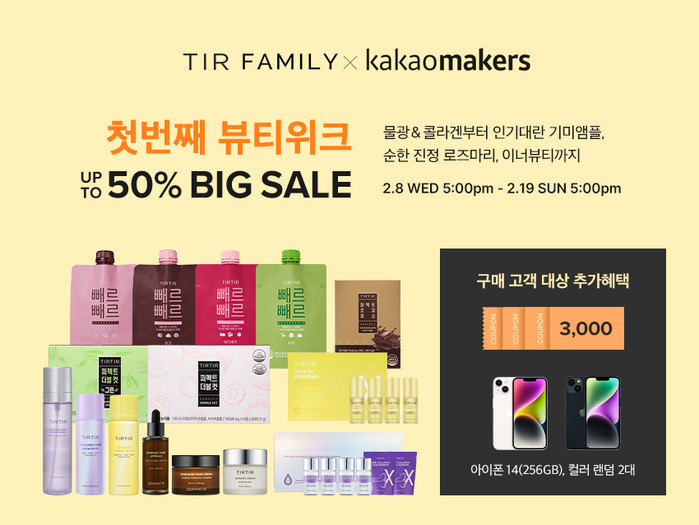 티르티르는 이를 기념하기 위해 카카오메이커스 2월 뷰티위크에 스테디셀러 제품을 최대 50% 할인 가격으로 제공, 아이폰 14 증정하는 깜짝 이벤트 등의 프로모션을 진행한다고 설명했다.