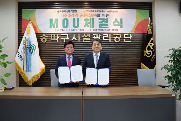 [시민일보 = 이대우 기자] 서울 송파구시설관리공단(이하 공단)은 최근 농.축산업에 몸담고 있는 장애인들의 권익 보호를 위해 설립된 한국장애인농축산기술협회와 업무협약을 맺고 상호 상생협력을 해 나가기로 했다.