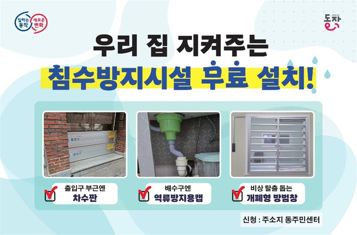 먼저 구는 관내 침수 우려가 있는 주택 및 상가 주민을 위해 ▲차수판(물막이판) ▲역류방지용 밸브 ▲차수 겸용 개폐형 방범창 등 침수방지시설 3종 설치를 무상 지원한다.
