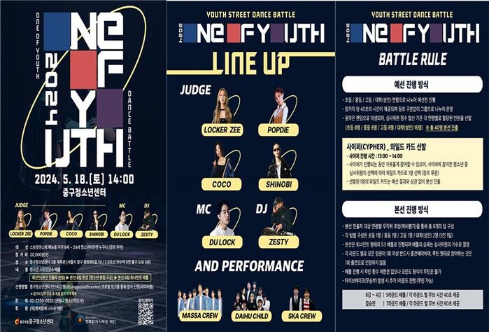 중구에서 처음 개최되는 이번 행사는 스트리트 댄스에 관심 있는 전국 모든 청소년이 무대에 오를 수 있다. 댄스라는 공통 분모 아래 지역 간 경계를 허문 화합과 축제의 장이 열린다.