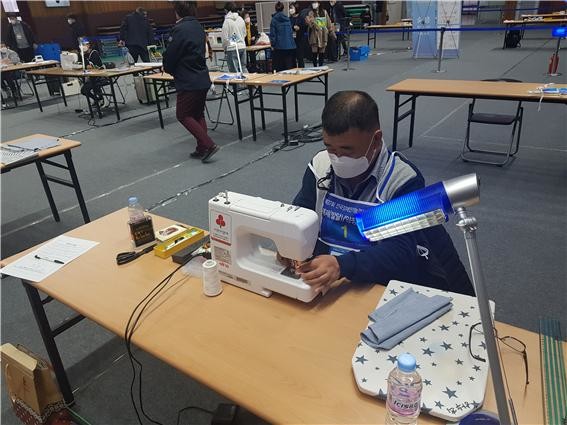 | ▲ 제37회 전국장애인기능경기대회 봉제(발달) 종목에 참가하는 전남 김태권선수가 과제를 수행하고 있다(출처=전남지체장애인협회) |
