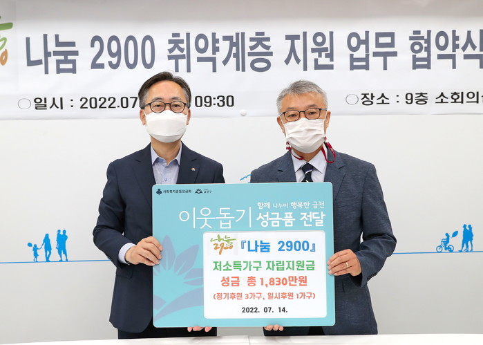 서울 금천구는 지난 14일 SNS 기부모임 ‘나눔 2900’과 취약계층 후원을 위한 업무 협약식을 진행했다. 협약으로 나눔 2900은 정기후원 3가정, 일시 후원 1가정 등 총 4가정에 1년간 1830만원을 기부하기로 약정했으며, 후원금은 서울사회복지공동모금회를 통해 선정된 가정에 지원될 예정이다. 사진은 협약식에서 유성훈 구청장(왼쪽)이 이재현 대표와 기념촬영을 하는 모습.(사진제공=금천구청)