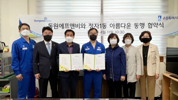 경기 수원시 장안구 정자1동은 11일 ‘동원F&B’와 공유냉장고 관리 및 운영에 관한 업무협약을 체결했다. 협약을 통해 동원F&B은 요플레, 우유, 치즈 등 유제품을 주 2회 정자1동 공유냉장고에 제공하기로 했다. 사진은 이날 협약식에서 관계자들이 기념촬영을 하는 모습. (사진제공=수원시청)