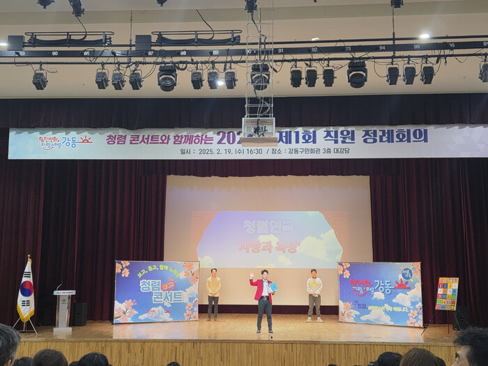 이날 2025년 첫 직원 정례회의를 맞아 구청과 동주민센터 직원 600여 명이 참여한 가운데, 이수희 강동구청장은 인사말을 통해 공직자로서 기본이 되는 청렴의무에 대한 경각심과 중요성을 다시금 강조했다.