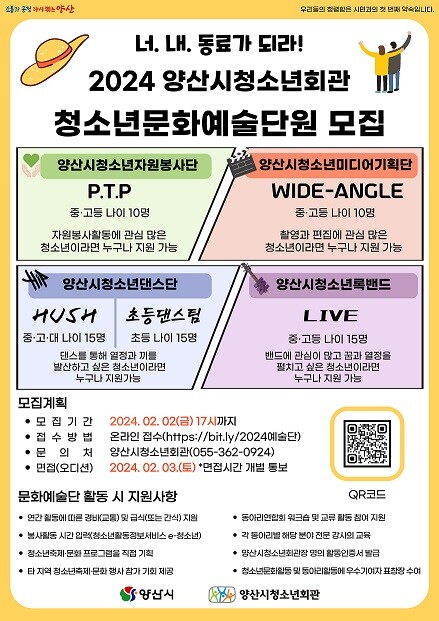 모집 분야는 <청소년축제기획단, 청소년댄스단, 청소년미디어기획단, 청소년자원봉사단, 청소년록밴드, 청소년댄스단>으로 6개 분야, 7개의 청소년예술단이다.